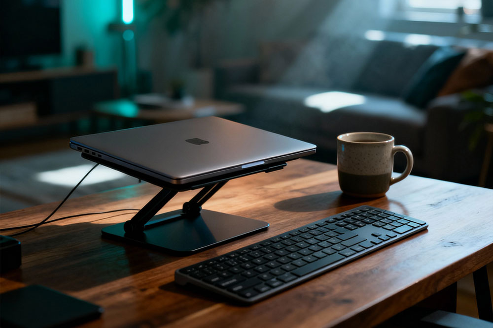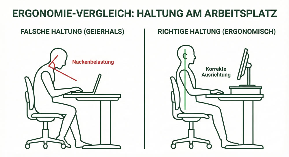 Das Hauptproblem im Home-Office ist meist nicht die Arbeit selbst, sondern die Ergonomie. Wer stundenlang auf einen Laptop hinabsieht, neigt dazu, den Kopf nach vorne zu schieben. Physiotherapeuten nennen das oft den „Geierhals“ (Forward Head Posture).
