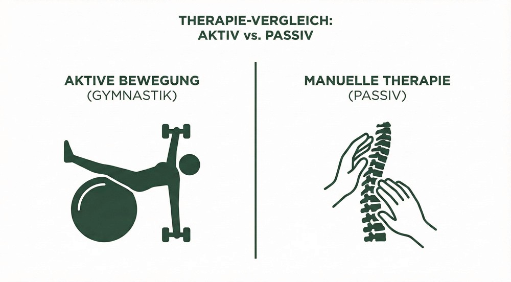 Ganzheitlicher Ansatz: Dieser Plan kombiniert aktive Elemente (Krankengymnastik im Übungsraum) mit passiven Impulsen (z. B. Manuelle Therapie oder Massage) sowie gezielter Beratung und Anleitung für den Alltag.
